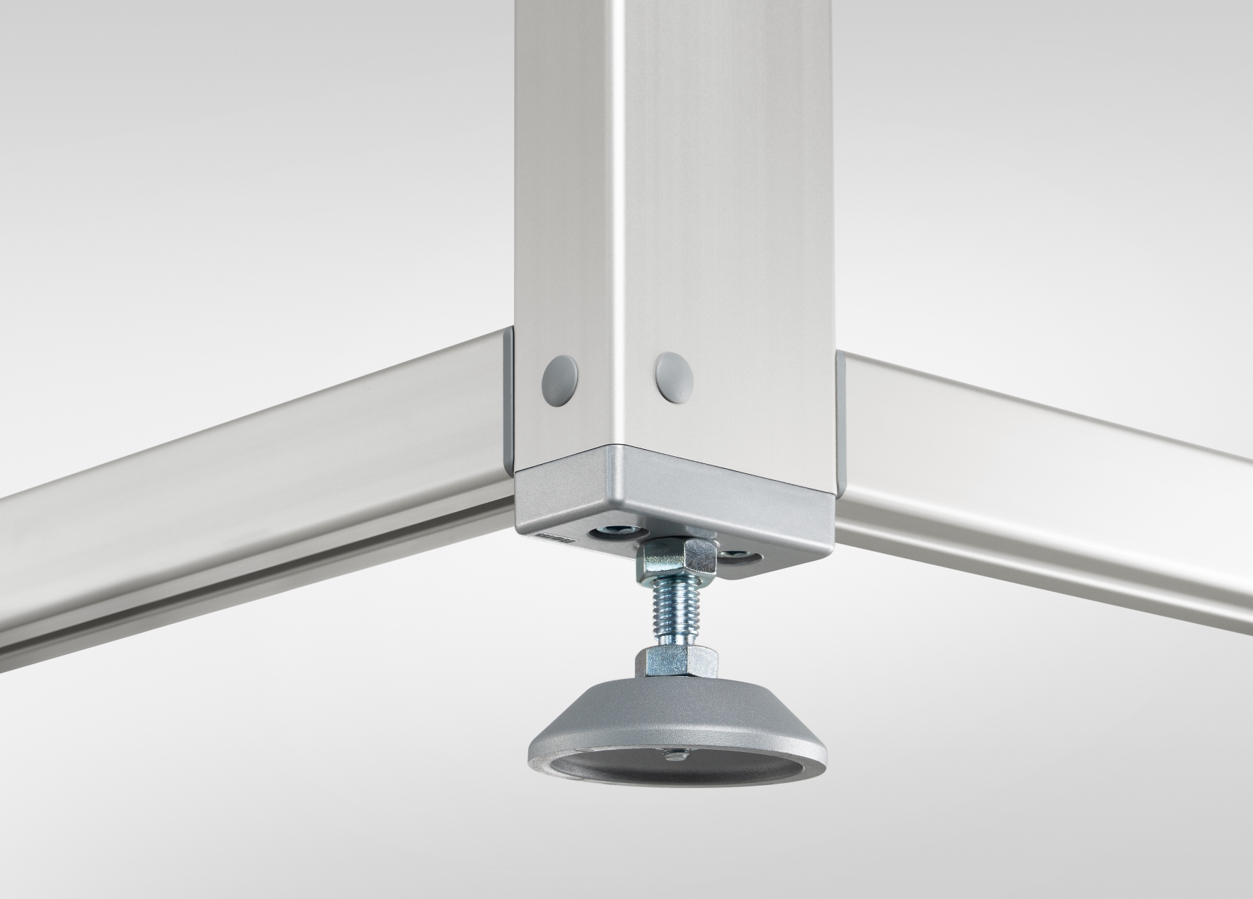 The new Base Plate 8, white aluminium and Knuckle Foot D80, M12x100, white aluminium ensure constructions and frames are always held securely in place and have an optimum footing – including on uneven floors. The 16mm-thick Base Plate is available in either the 80x40 or 80x80 design, is made of die-cast zinc and screws into the core bore at the end of the profile. The available thread sizes M10, M12 and M16 ensure the feet and plates are suitable for universal use. The white aluminium colour of the Base Plates ensures the finishing touch at the end of item aluminium profiles matches the overall look. Both castors and feet can be fitted into the central threaded bore. The new Knuckle Foot D80, M12x100, white aluminium supports stepless height adjustment thanks to its thread, adapting perfectly to unevenness in floors with its tilting ball socket.