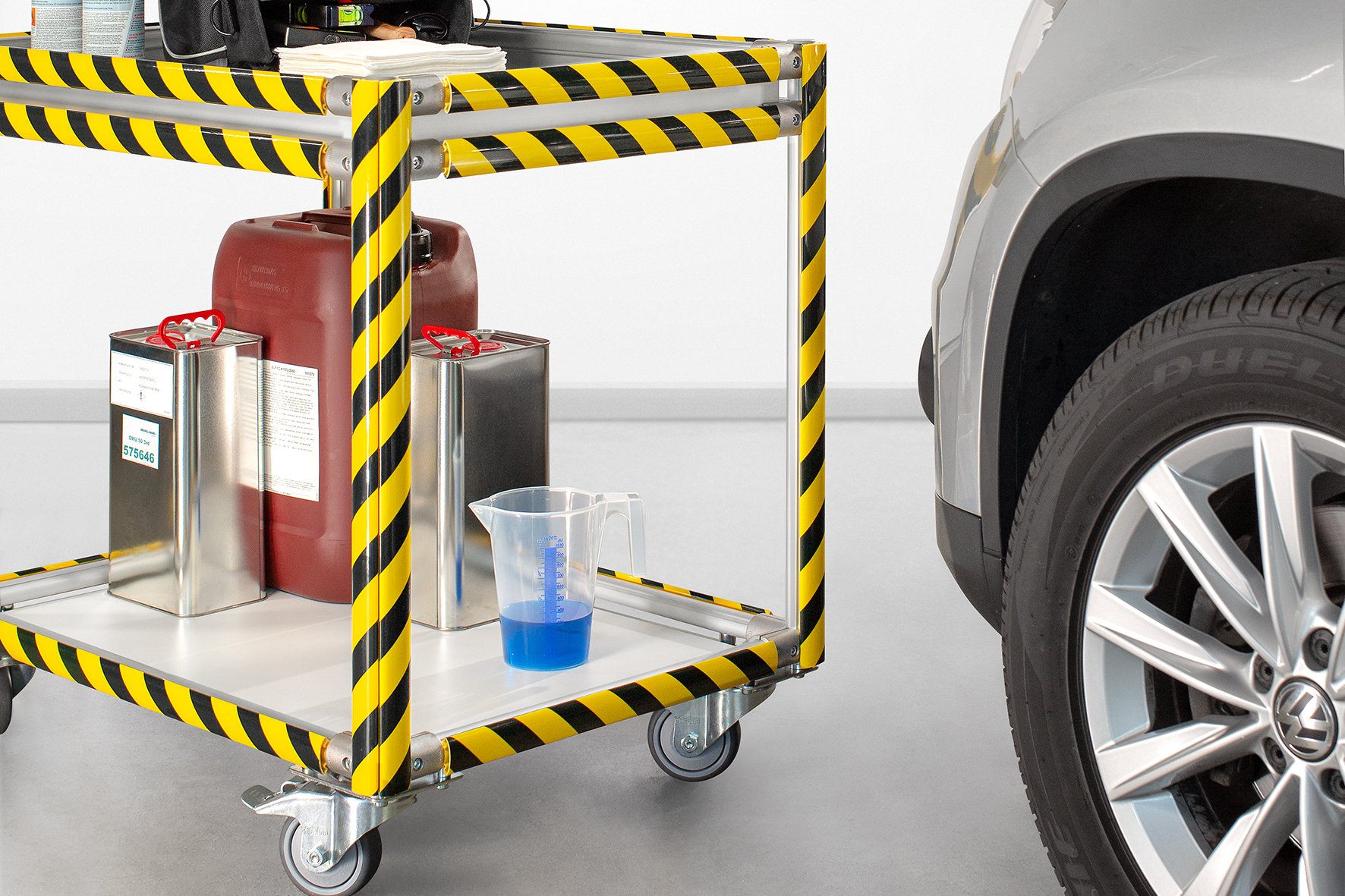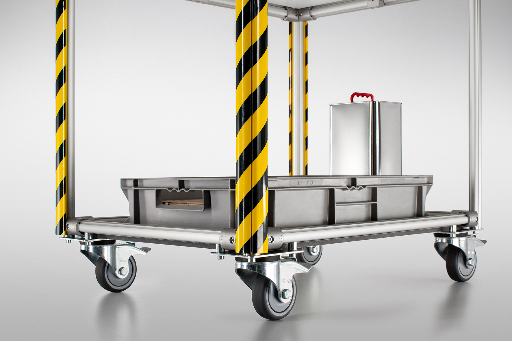 Black and yellow hatching is a striking feature that makes the new Warning and Protective Profile D30 R28-90° from the item Lean Production Building Kit System impossible to miss. The profile offers maximum protection for people, frames and transported goods at exposed areas and in hazardous zones. It is simply clipped onto the flank of a Profile Tube D30 in a matter of just seconds, making it also ideal for temporary use on profiles, as it is easy to install and quick to remove. The elastic chamber of the new Warning and Protective Profile deforms to absorb impacts, thus offering optimum protection for staff and materials alike.