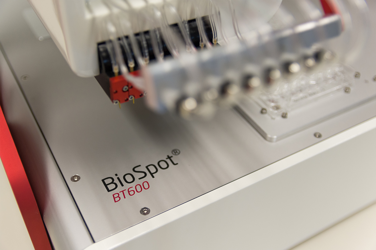 Caption 2: The BioSpot workstation combines various dispensing technologies on a single automated platform. Depending on customer requirements, the devices are built to unique specifications and vary in length – which is no problem, thanks to the flexibility of the item building kit system.
